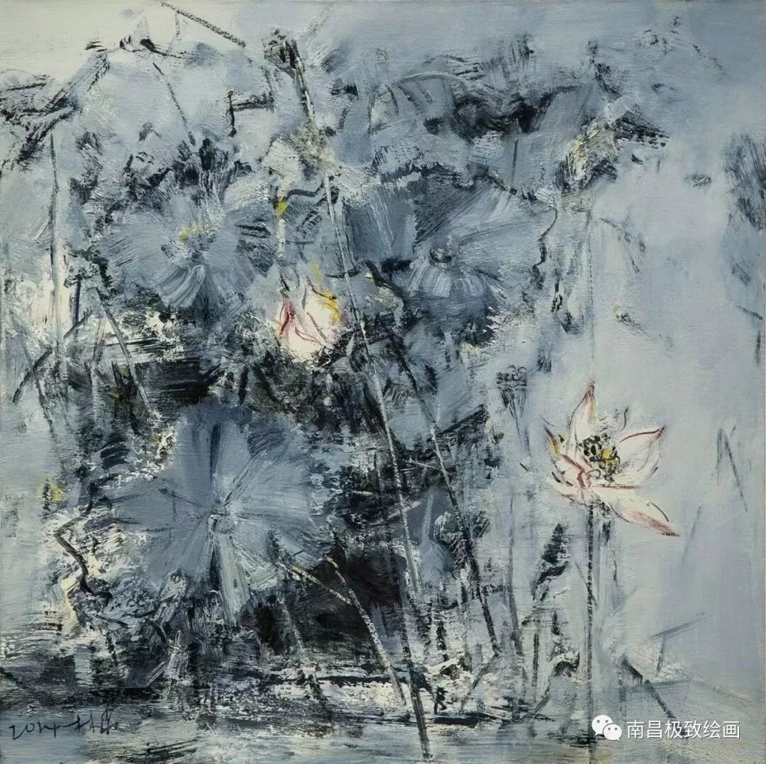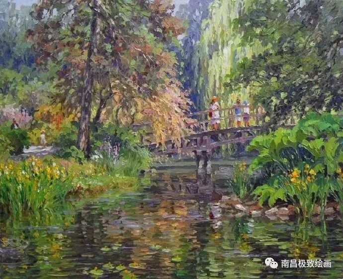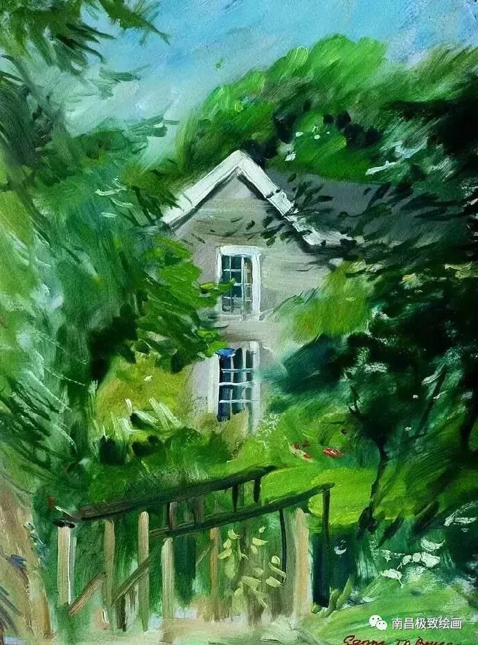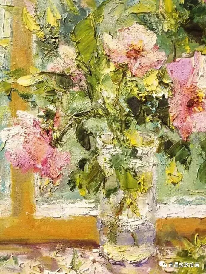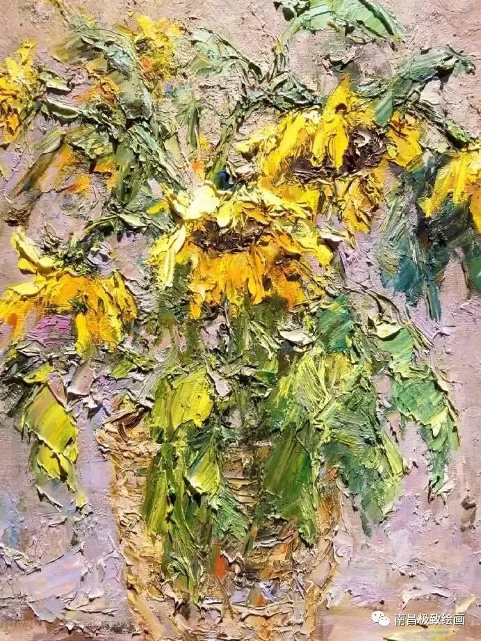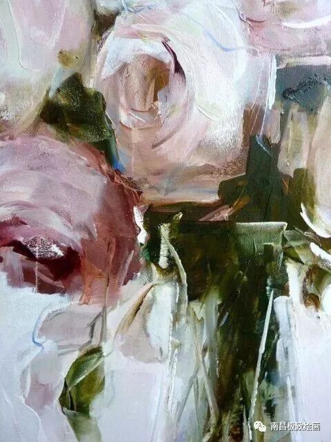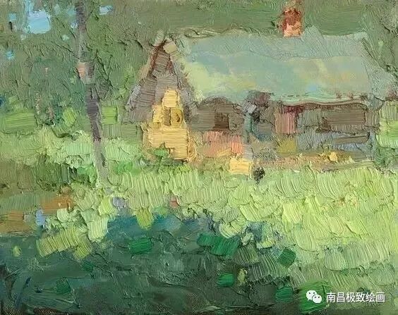 抑是用刀的底面在湿的颜色层上轻轻向下压后提起。颜色表面会产生特殊的肌理,一种小的笔触堆积,形成一种深厚的画面效果。