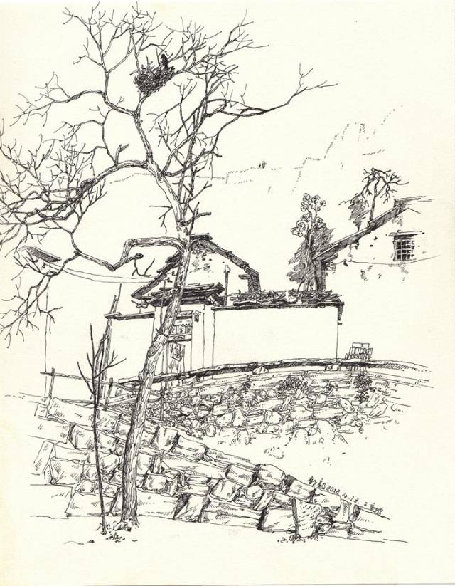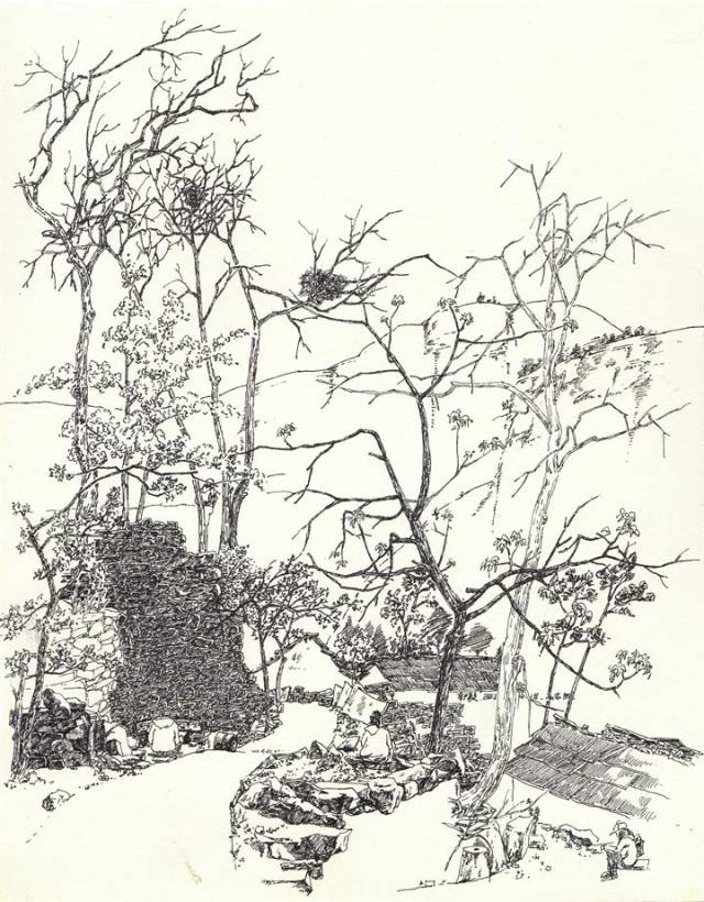 这棵画了一半的树就是用影线和交叉排线构成。再用一些影线和交叉排线.以及随意的笔画就可完成了,