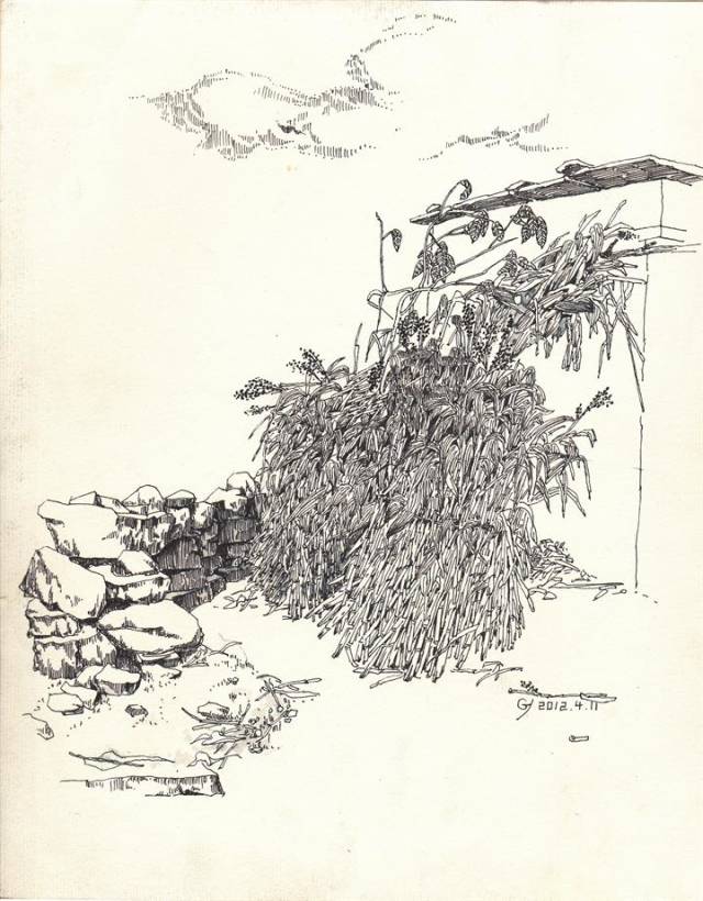 第四步,开始画近景,这里的近景是一堆被雪覆盖的柴草,注意观察生活中物体,柴草一般都是比较杂乱,有规律的很少,所以画的时候要注意变化,首先画出几枝比较明显的柴草走向,其他的画出层次就可以了