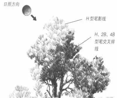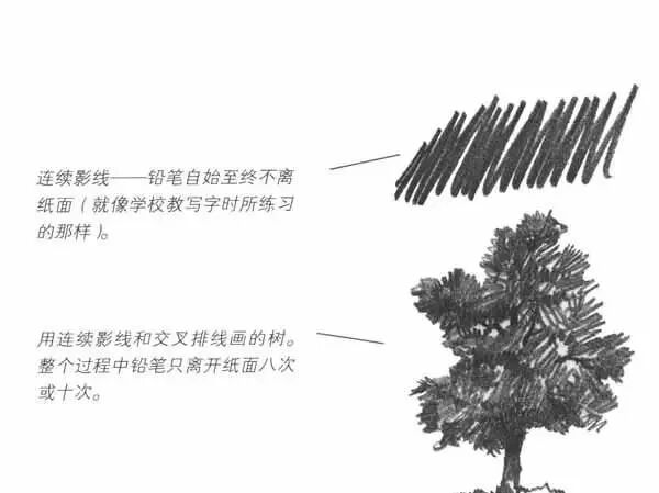 用这些笔法制造阴影效果时,你得注意阴影投向的物体表面的质地。如果表面光滑,一般用细腻的影线比较好。如果表面粗糙,如树皮,那么用稠密的影线(就像前页那棵树)或是有力的交叉排线比较好。
