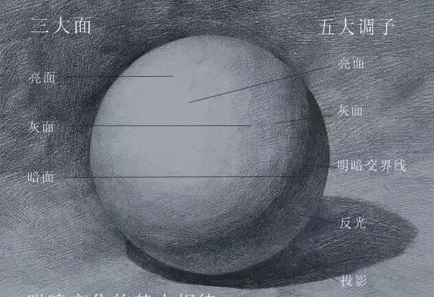 三大面:如圆球、圆柱体上在侧面来光的情况下,把产生的明暗调子分成三大部分:(1)受光部分(2)背光部分(3)明暗交界线。这三大部分叫三大面。也有人称方形物体,如正方体,长方形物体在侧面来光的情况下,产生的受光面、顺光面、背光面叫做三大面。