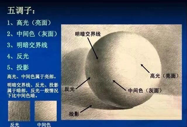 五调子是指具有一定形体结构、一定材质的物体受光的影响后在自身不同区域所体现的明暗变化规律。