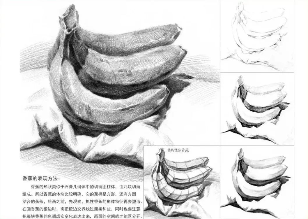 ①然后我们来讲一些比较常见的水果和蔬菜。香蕉的形状类似于石膏几何体重的圆柱体,由几块切面组成。所以香蕉的体块比较明确,它的蕉柄是方形,还有方圆结合的蕉蒂,绘画之前先要观察,要准确的抓住香蕉的形体特征再去塑造。在画香蕉的棱边时,棱边交界线的过渡要柔和一点,同时也要注意把每块香蕉的色调虚实变化表达出来,画面的空间感才能区分开。