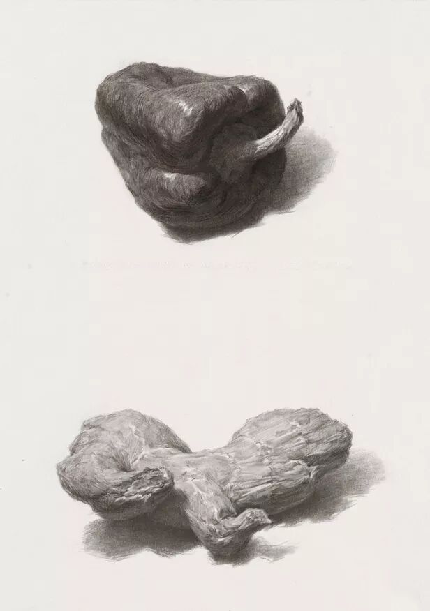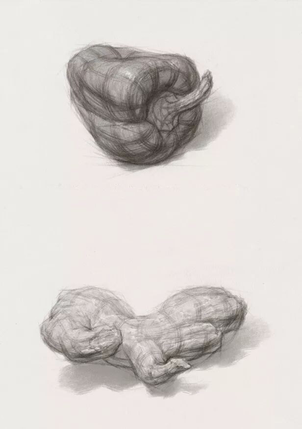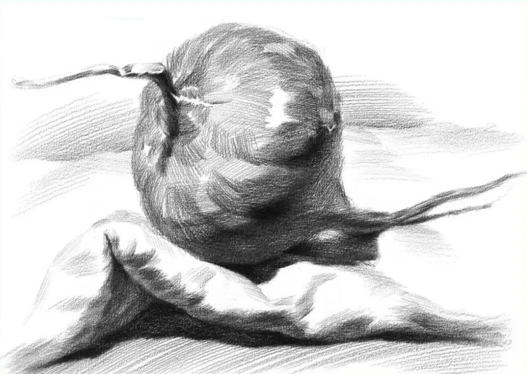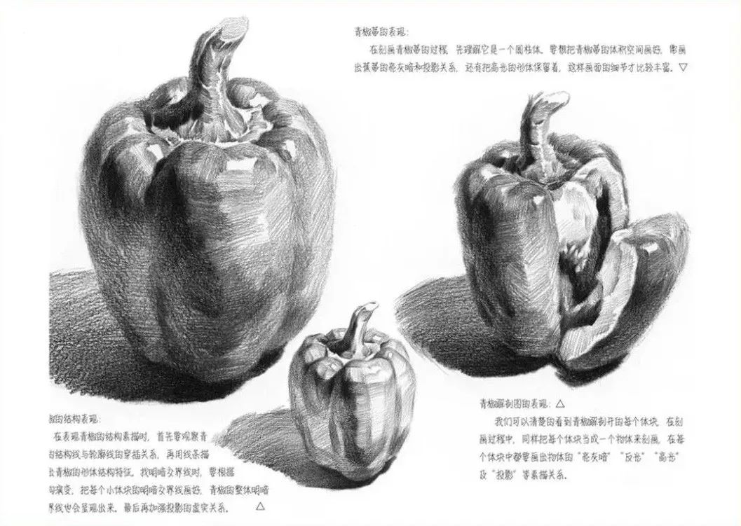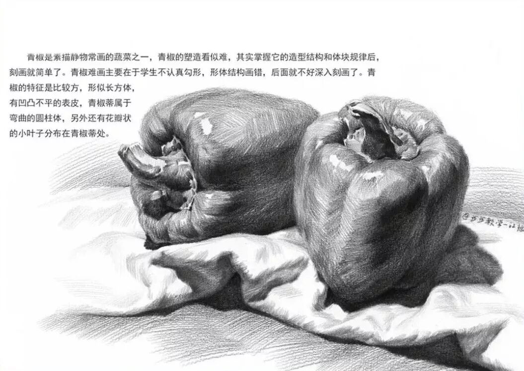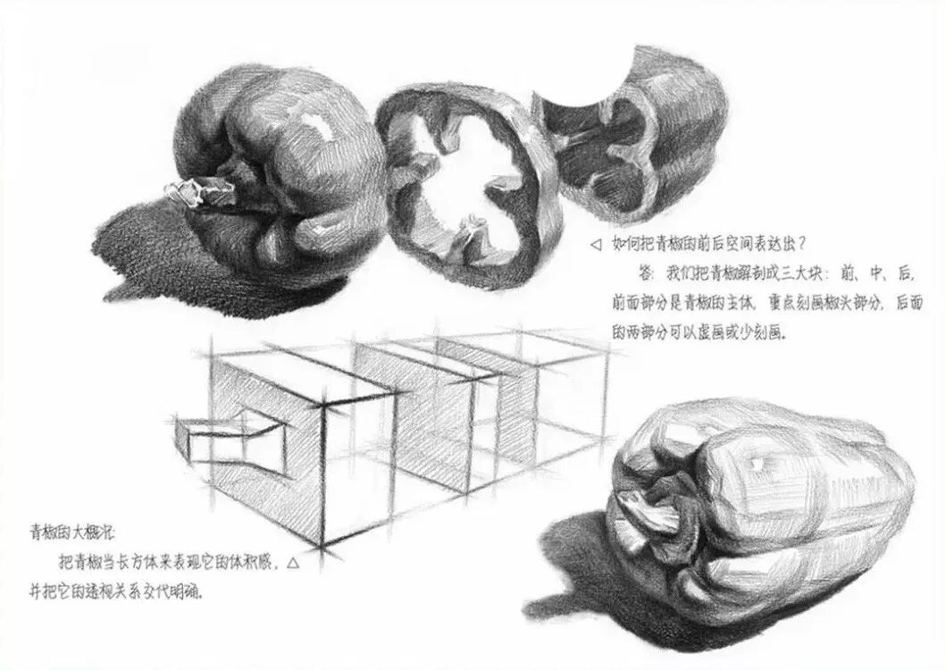 ②青椒的特征是比较方,形似长方体,有凹凸不平的表皮,青椒蒂属于弯曲的圆柱体,另外还有花瓣状的小叶子分布在青椒蒂处。在画调子的时候可以把它理解成一个圆柱体,还是先找明暗交界线,注意一些细微部分的转折以及过渡,过渡的部分一般会有高光的出现,注意要留出来。然后不要画得太生硬,毕竟青椒是蔬菜类的,不是石膏,转折不会很生硬,要通过线条来让转折更圆滑。