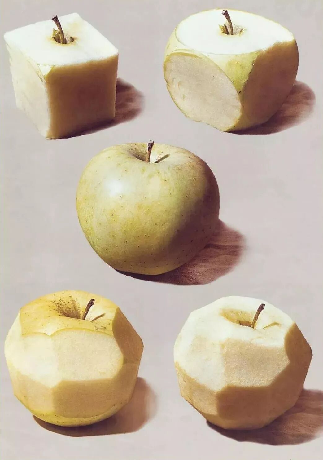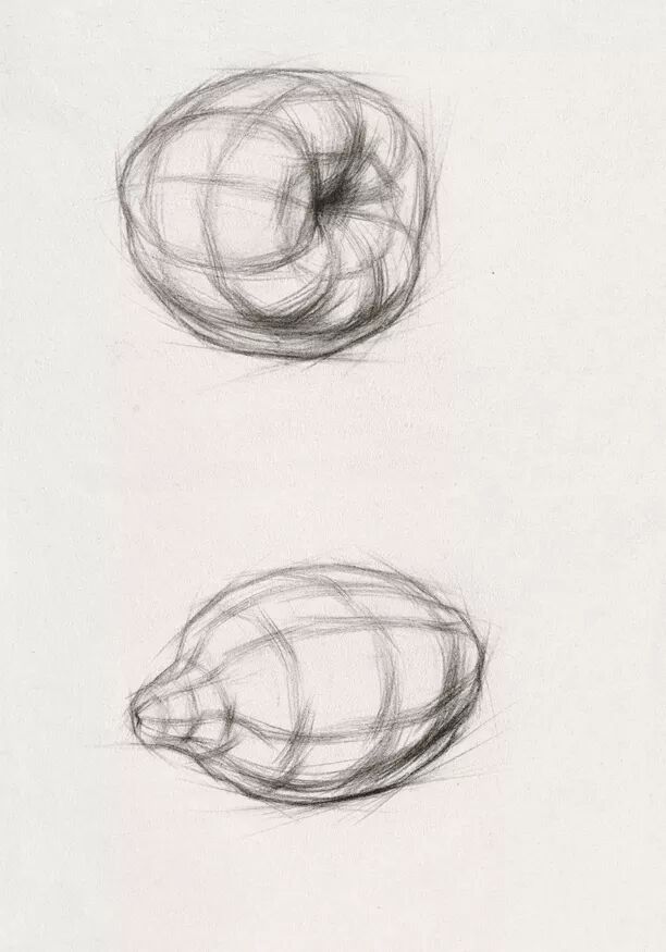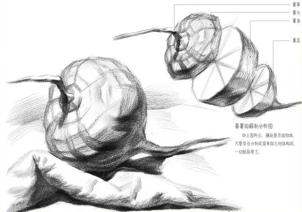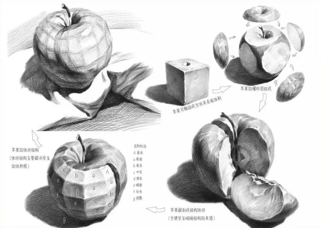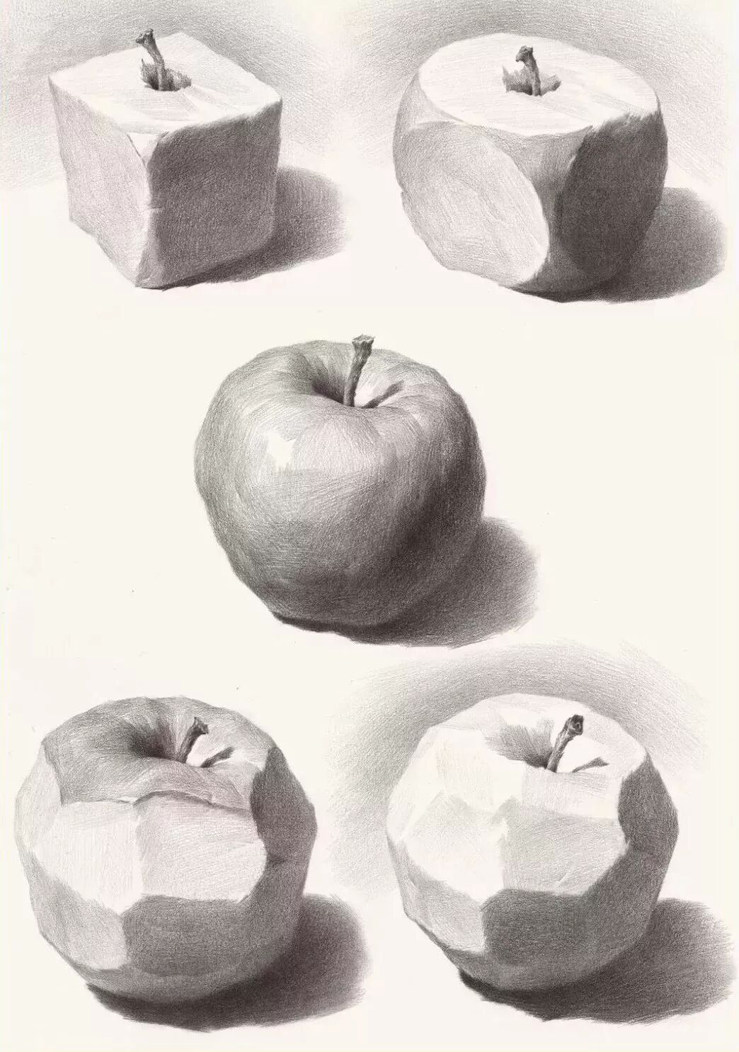 ②苹果的外形可以比作正方形或者球体,但是苹果的边缘线并不规整,有圆有方,变化非常丰富,体感比较强。我们在画的时候要把几块大的体面区分出来,调子再多也要符合整体,细节不能强过整体。注意看最后一个削了皮的苹果,体块感非常强,我们在画正常苹果的时候可以借鉴这种体块关系,先方后圆,哪怕我就画方一点都没有关系。