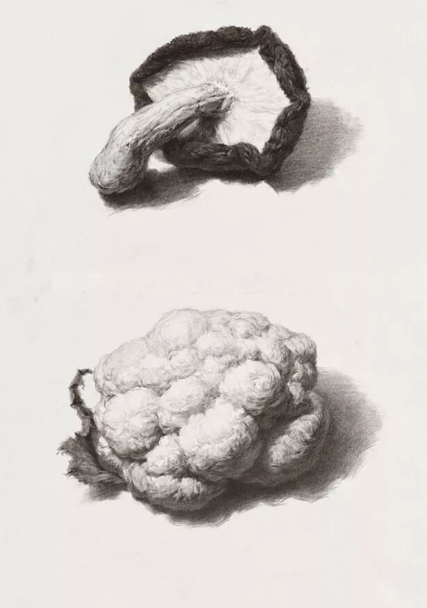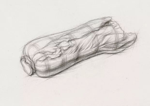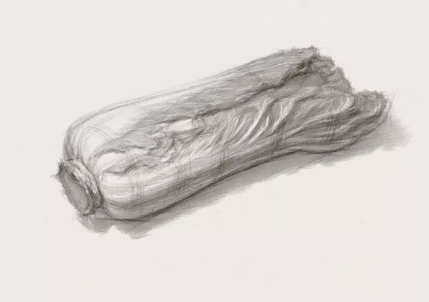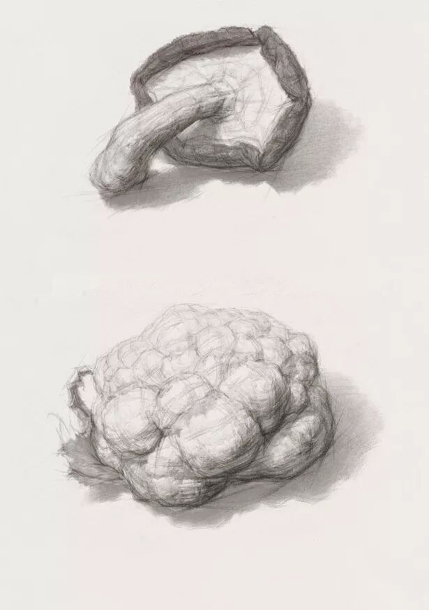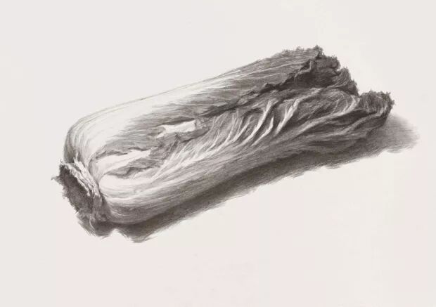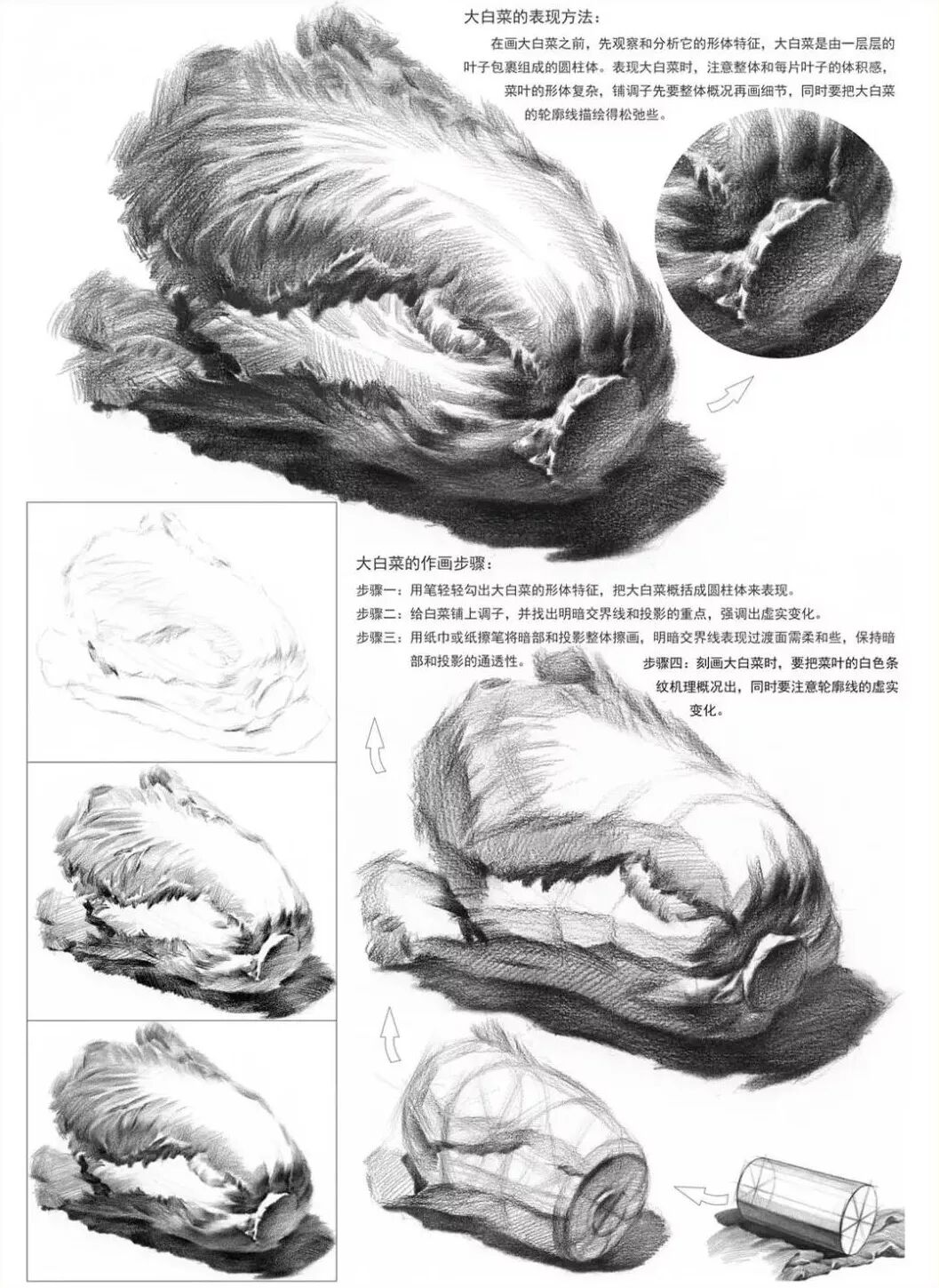④大白菜相对来说是比较难画的,大体上还是可以看成一个圆柱体,注意这个只是说它大概的轮廓以及明暗交界线的规律。那么细看大白菜就会发现它的特征也非常明显,它的叶子是一片片叠加起来的,同时都往最底下的白菜头收拢,这样叶子的形体也就很明确了,稍带一点弧度,同时在白菜头的部分有一个大的转折,然后就是一些细节的处理,叶子的质感以及叶子之间叠加的关系等等。最开始画的时候一定不要沉迷于这些细节,要在最后再来丰富会更加合理。