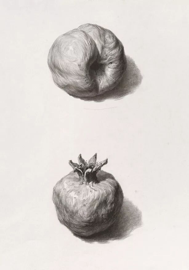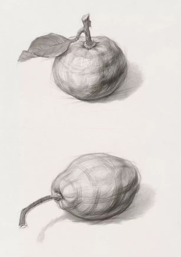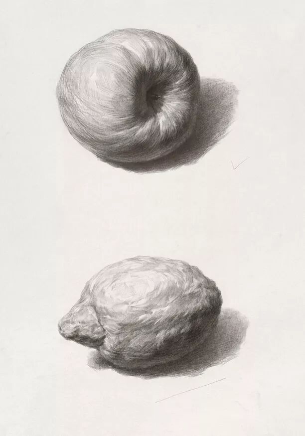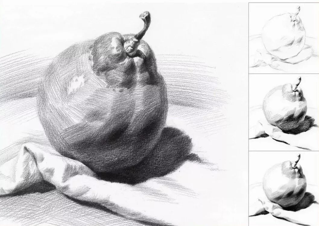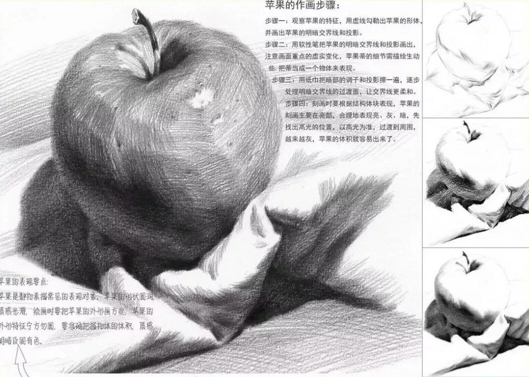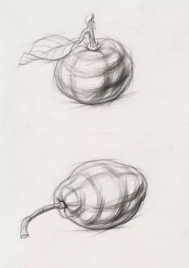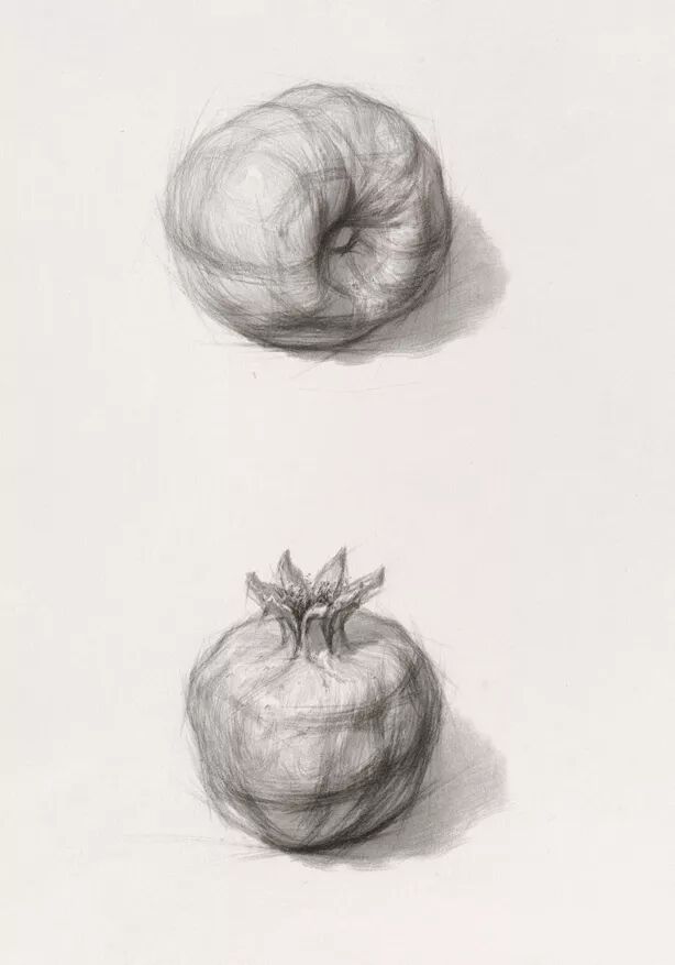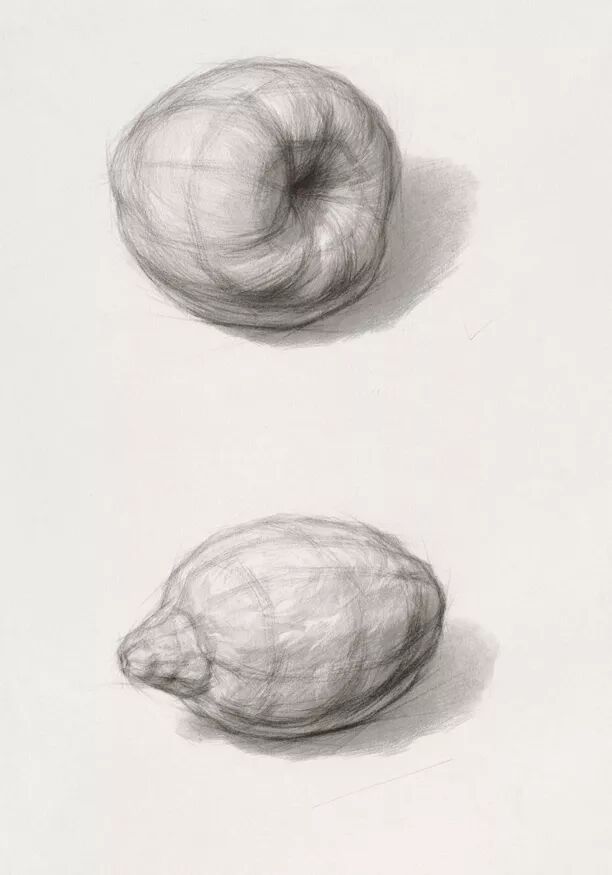 ①首先我们要知道苹果的形体绝对是有一定规律可寻的,在画调子的时候大致可以和画球体时一致,第一步是打形,然后找到明暗交界线,统一暗部,再围绕着明暗交界线去画,根据画面的进展不断丰富整体的调子,层次可以画非常多。整体的要求是不要画得太灰,除非是画面要求,在练习的时候可以在一张纸上画多个角度的苹果,削皮的或者是切开的都可以,要通过了解内部结构来画就会更简单。