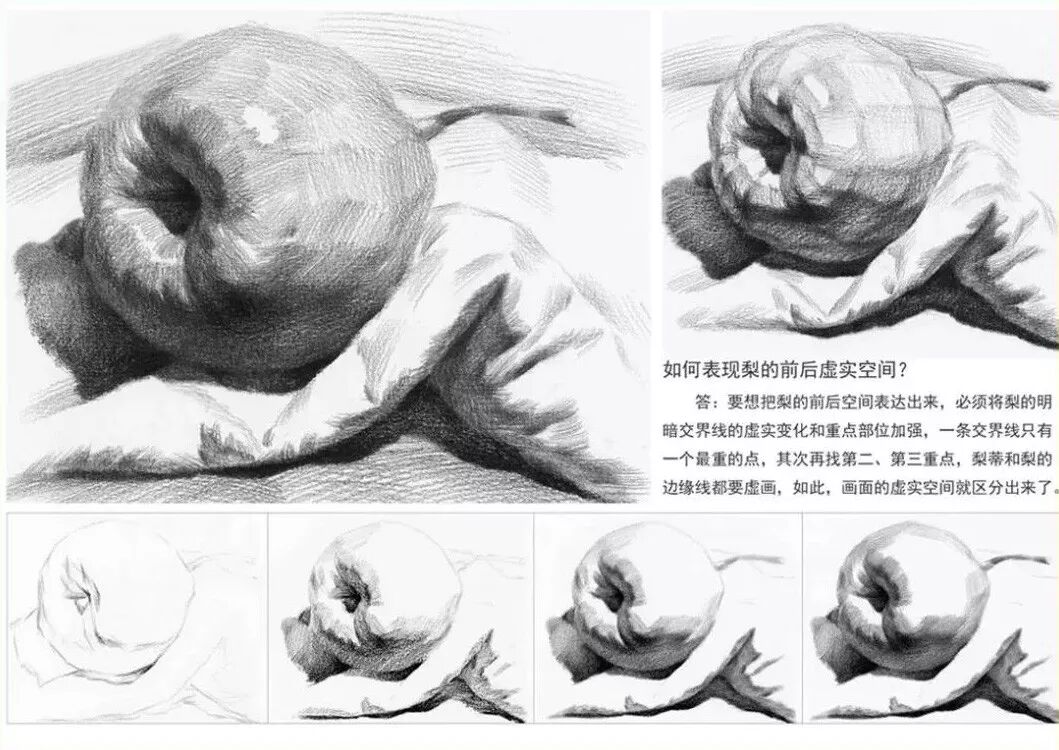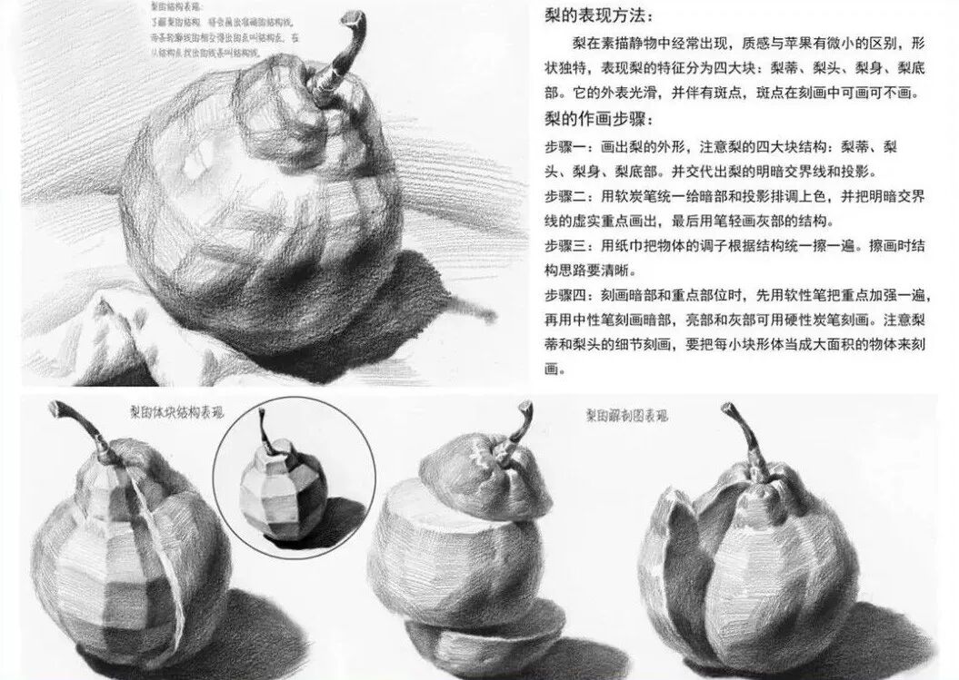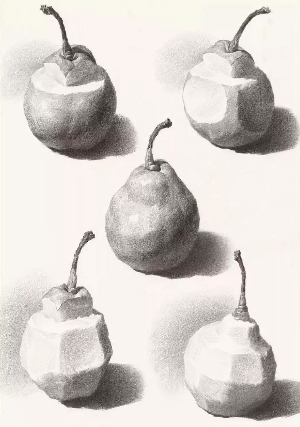 ③那么梨子和苹果在作画步骤上没有太大的区别,都是找形、找明暗交界线,然后不断丰富层次,不同的点在于梨子与苹果的内部结构有一定的区别,甚至说不同的梨子也会有很大的区别。那么我们在找明暗交界线的时候就要注意其内部结构的变化,明暗交界线不是几根线或者是很生硬的线条就能表现好的,一定是通过一个个有变化的面去表现,水果画得好不好就要看结构和明暗交界线找得好不好。