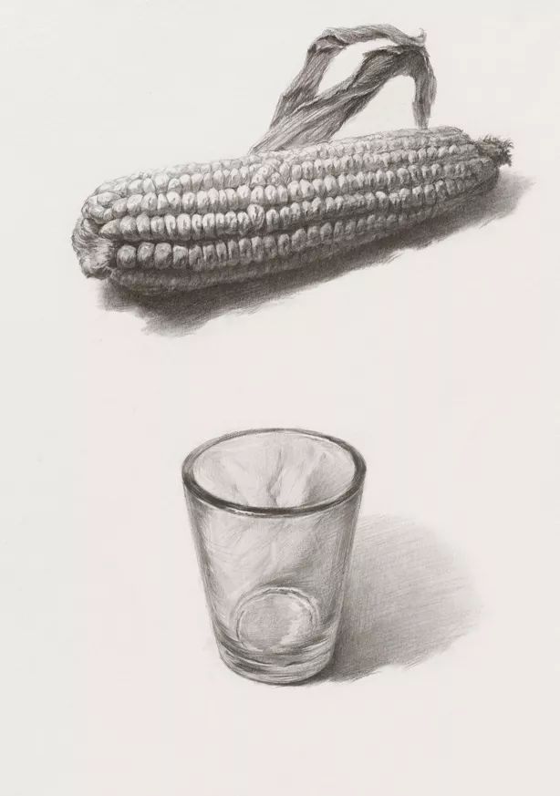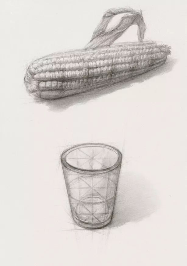 ④梨是球体和三角锥体相加所产生的形状,它的造型与朝向是画面生动性的重要体现。梨固有色的表达要与整体结构、体积相协调,蒂把等局部细节也要注意整体感。此外,边缘线要有强弱、虚实变化,使其体积感更强烈。梨子的下半部分是比较圆的,但是也并不是圆到没有体块变化,所以我们还是要把体块关系牢牢的把握住,“宁方勿圆”是素描静物中不变的真理。