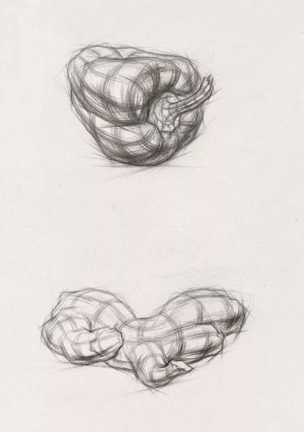 ⑥下图中这种侧躺着的梨子就比较难画了,因为梨子的形体变化最丰富的地方就是它的屁股部分,其实和苹果窝有一点像,但是梨子的更加有那种肌肉的感觉,整个体块非常饱满,形体非常扎实。同时也要注意暗部要透气,蒂把要画得扎实有变化。如果说你能把梨子处理到这个程度,那么绝对是非常精彩的。