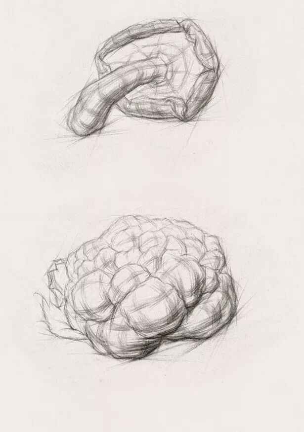 ③葛薯的形体和洋葱有一点类似,都是中间扁扁的,遇到这类蔬菜的时候我们可以先把它的结构拆分一下,这样就可以很直观的看到它的结构,也就知道要怎么去画。下图右侧这个解析图就非常直观,把葛薯分成三个大块,每个块面之间的转折以及明暗交界线也非常清楚,再去画的时候就简单多了。