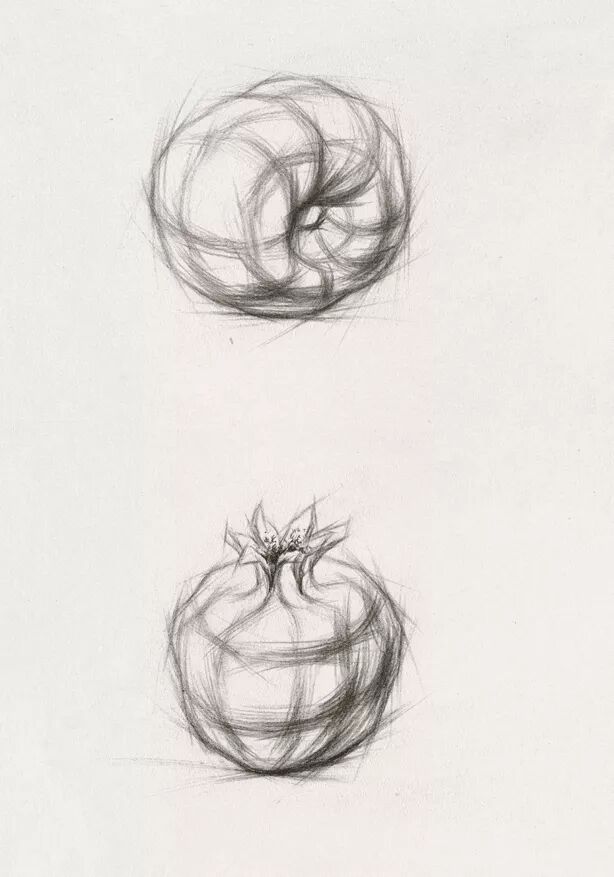 ④画梨子还有一个重点就是它的“梨窝”这一块的处理,这个部分如果像下图中这样是对着我们的,那么就一定要画好,重点在于它是从四周延伸进去的,那么这个转折的感觉就要把握好,在排线和黑白灰的安排上要合理,线条眼跟着结构走,明暗关系要有那种延伸进去的感觉,适当的夸张也可以强化梨子的形象。