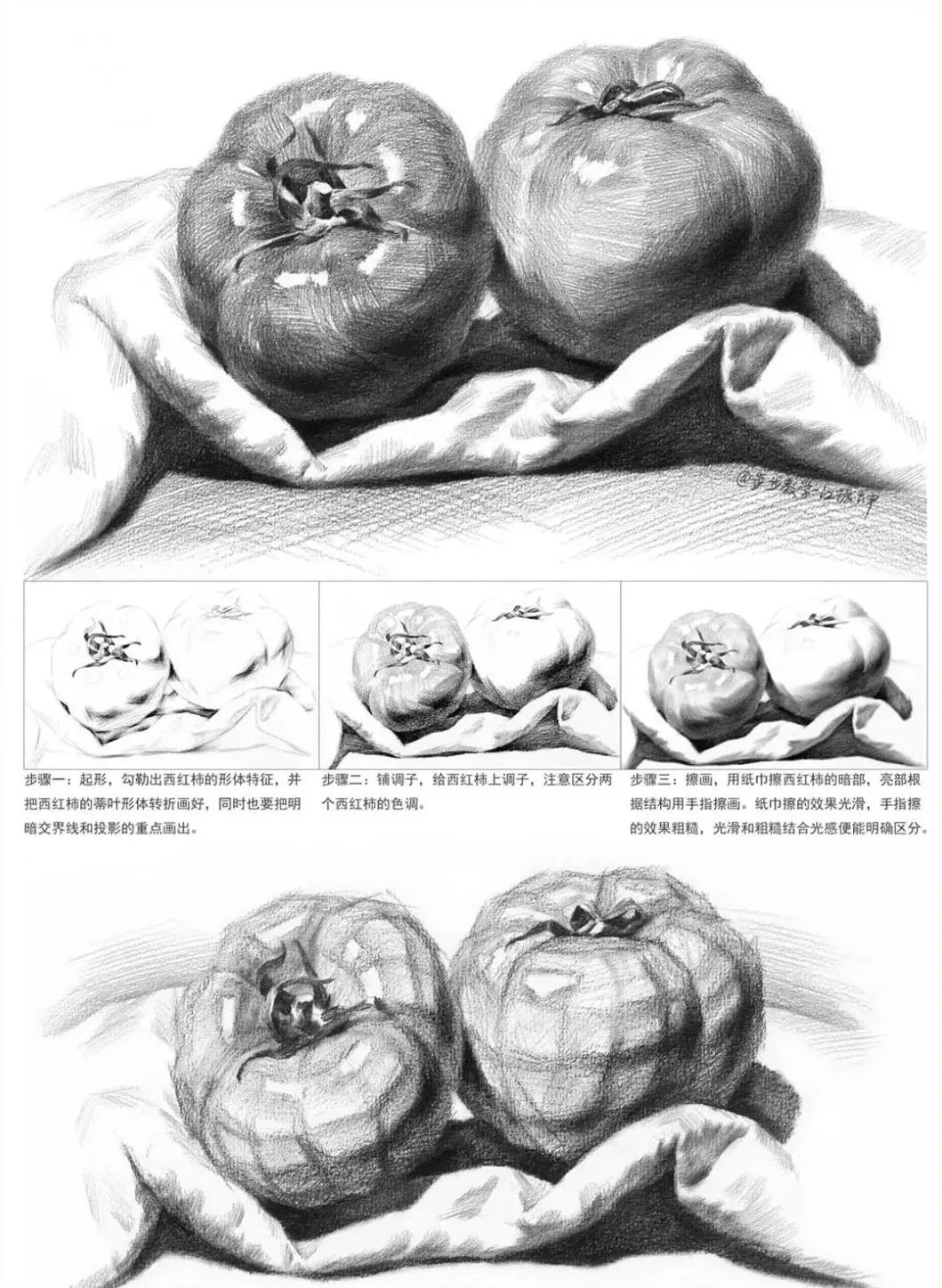 ⑤西红柿整体与苹果非常类似,不同点在于西红柿的形体是很明显的起伏变化,西红柿的外形圆润饱满,不过不能画得很圆,大家可以依据分析圆形体的形式来分析西红柿,形体可以理解为简单的球体上隆起多个大小不一的半球,形体类似于大蒜球和橙子。西红柿表面很光滑,但是在刻画时要注意有意识地“切块”,使形体具有一定的“硬度”,这样能更好的表现出分量感。