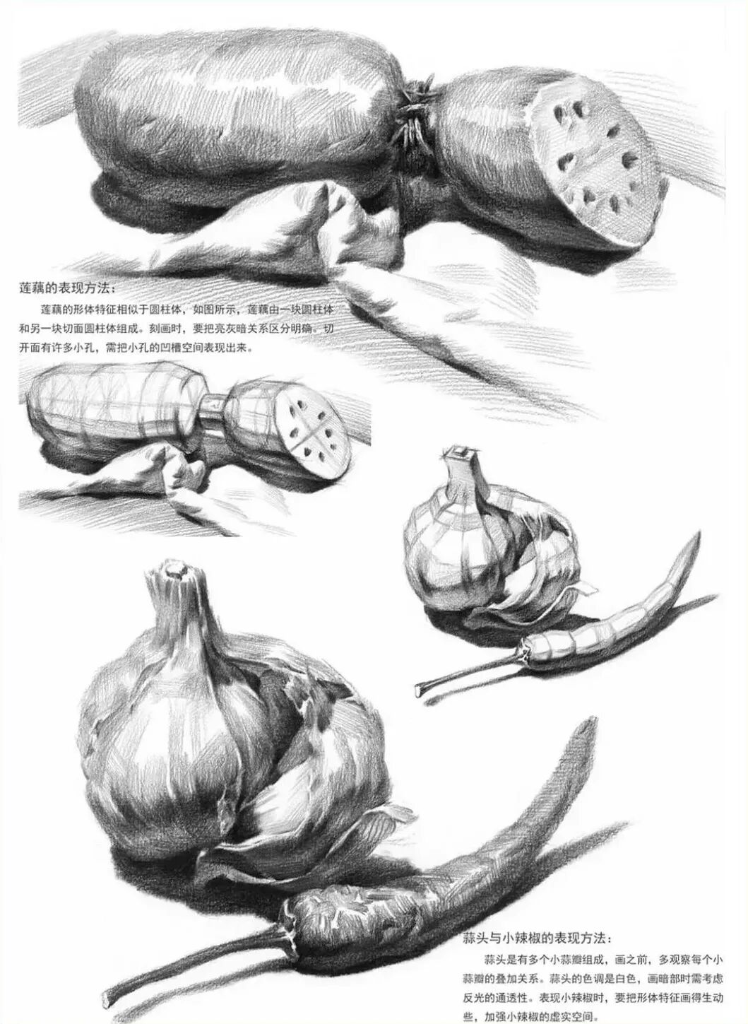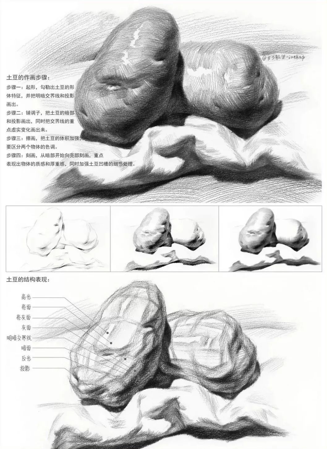 ⑥土豆相对来说就很简单了,形体非常明确,也没有太多的变化可说,无非就是它的表面非常不平整,也相对粗糙,那么我们在排线和细节刻画的时候就要注意这两个特征,不能把土豆画得和西红柿一样。这种形体上没有什么特征的蔬菜水果就要在质感上有所区分,不然画出来都不认识是什么就很失败了。