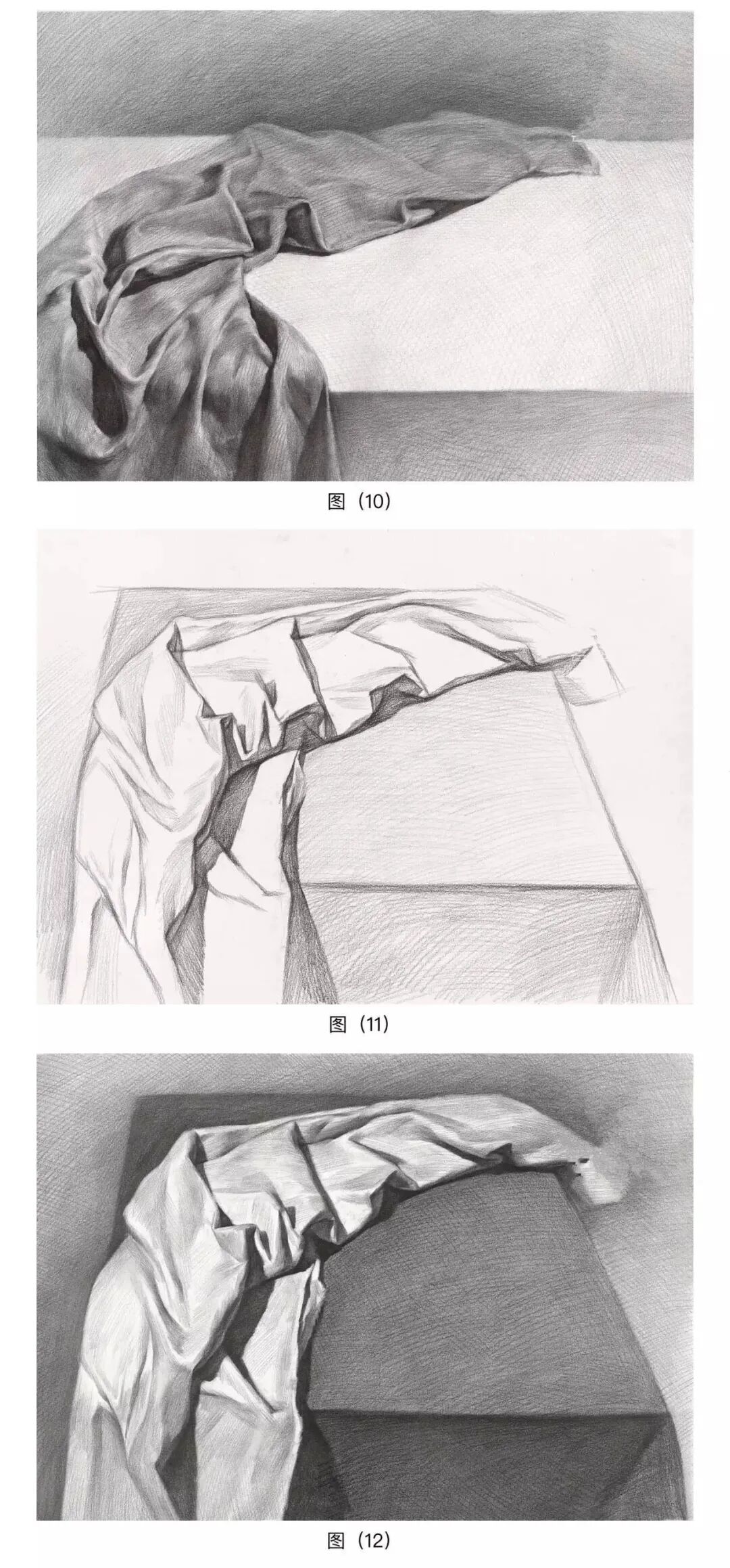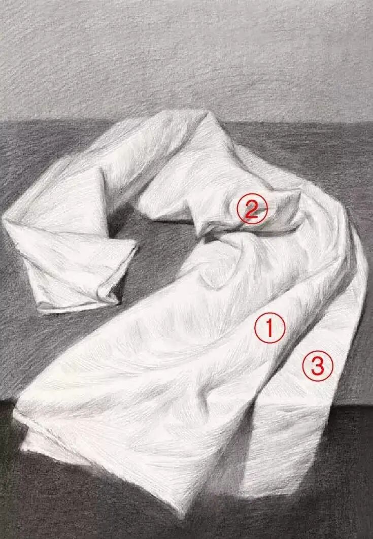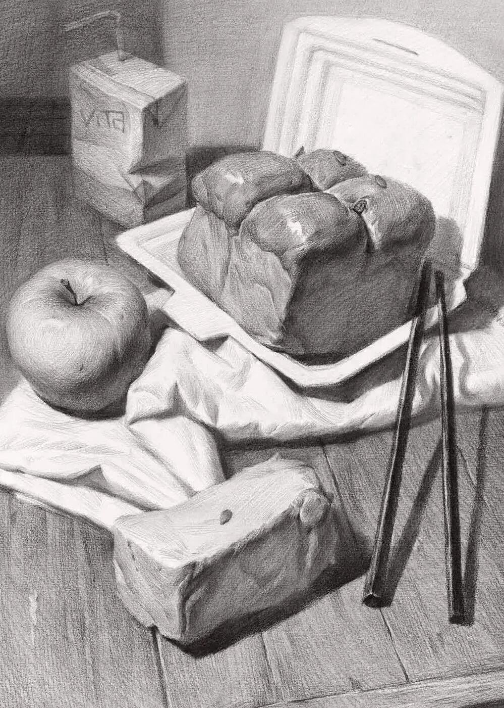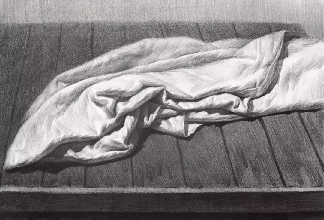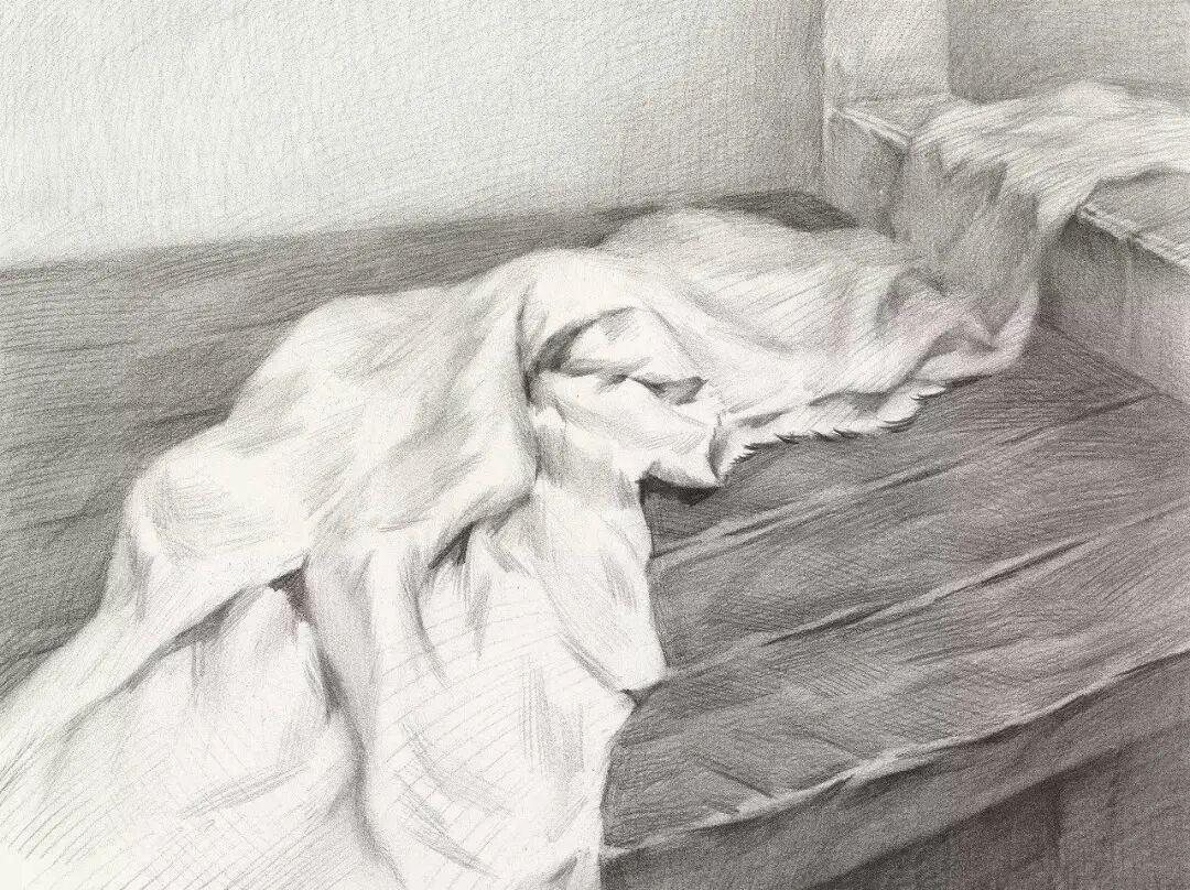 以桌面为主要空间的构图素材,画面中含有另外一个远处空间。衬布贯穿整个空间,这种情况下,衬布近处较亮,远处较灰。近处的衬布布褶刻画详细,用笔清晰;远处的衬布布褶刻画柔和。