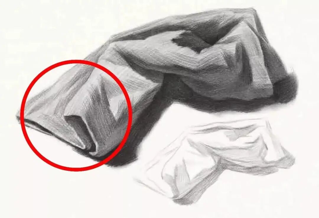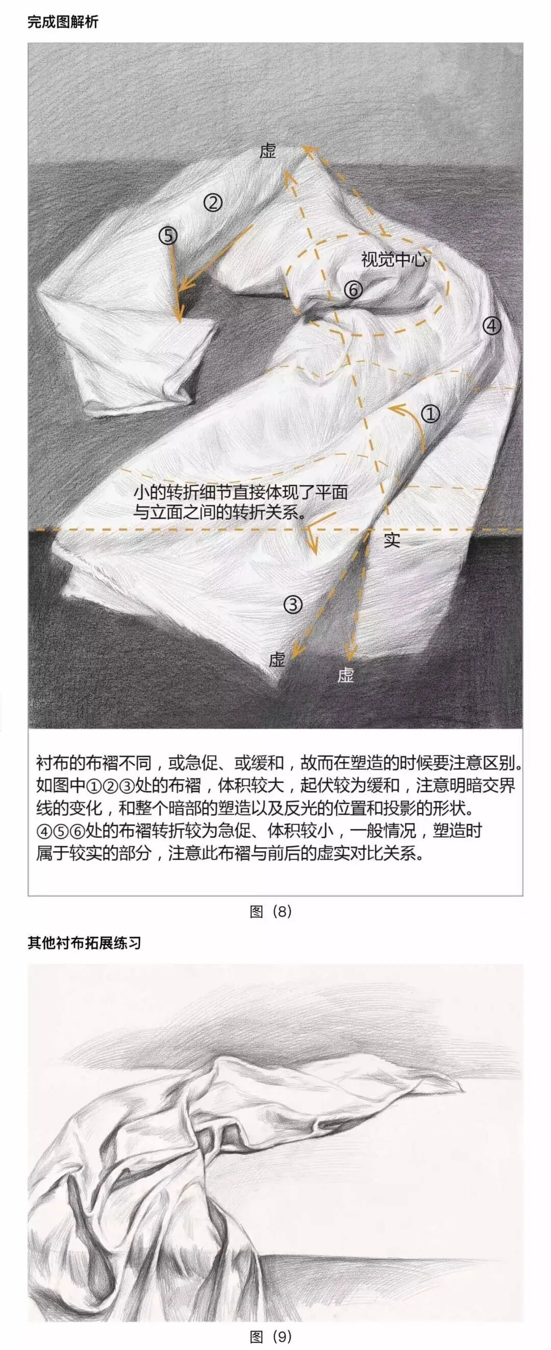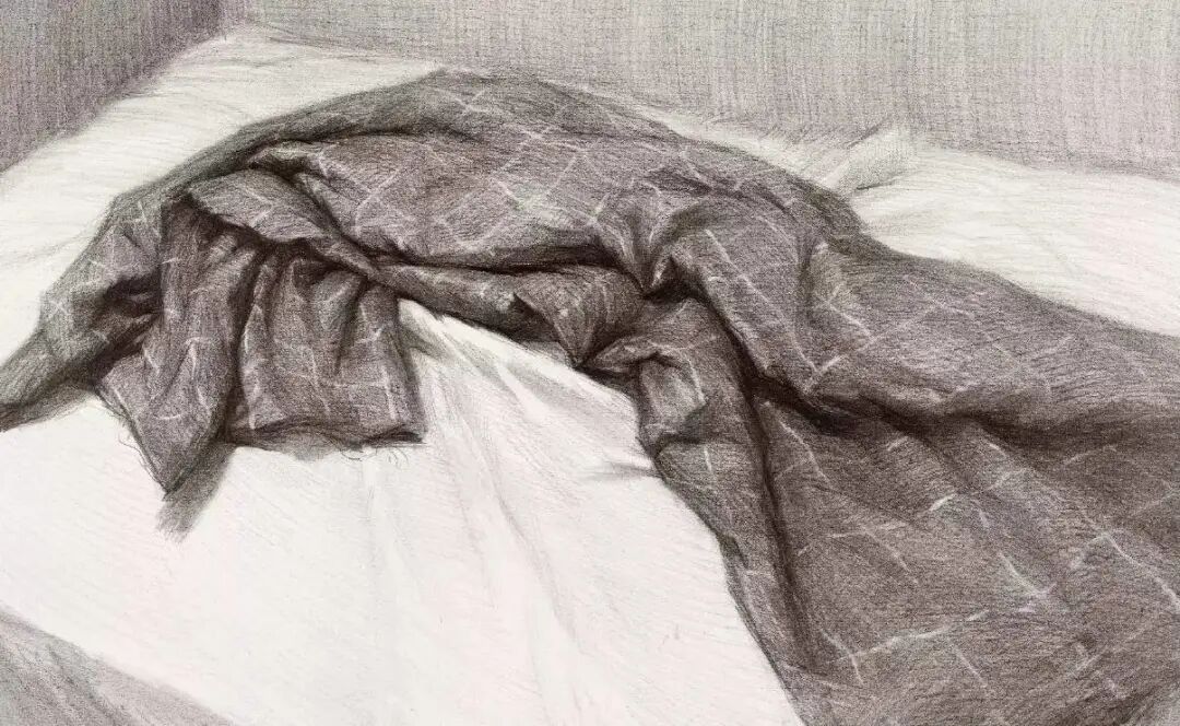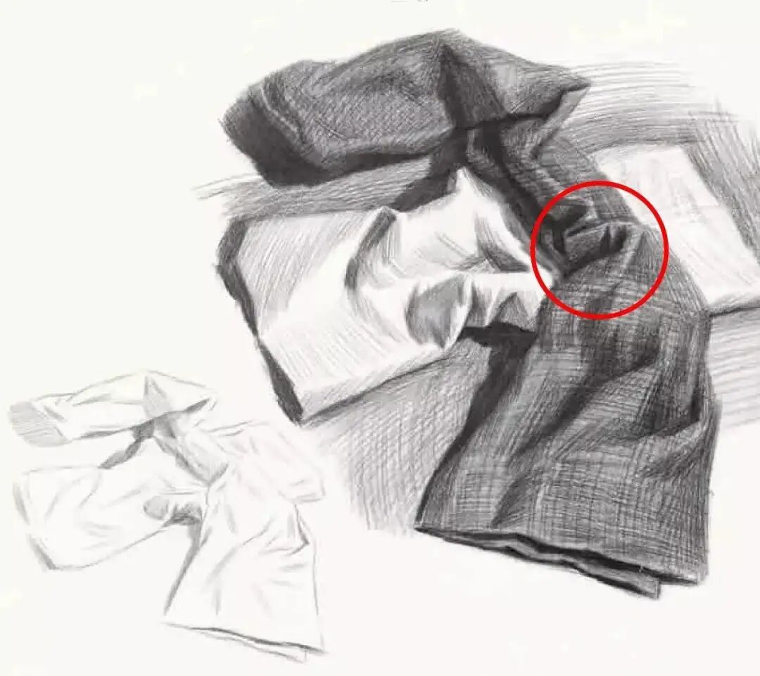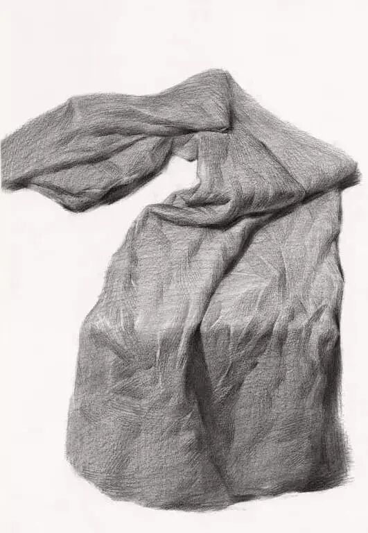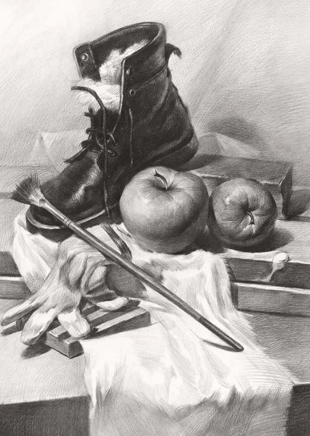 以桌面为主要空间的构图素材,画面中含有另外一个远处空间。衬布贯穿整个空间,这种情况下,衬布近处较亮,远处较灰。近处的衬布布褶刻画详细,用笔清晰;远处的衬布布褶刻画柔和。
