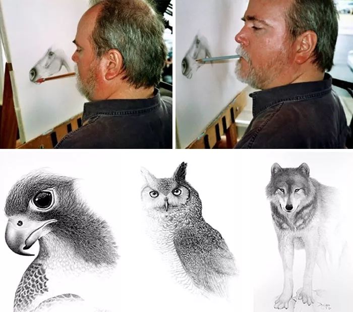 他靠着坚强的毅力,用嘴跟脚自学画画