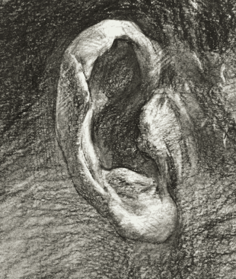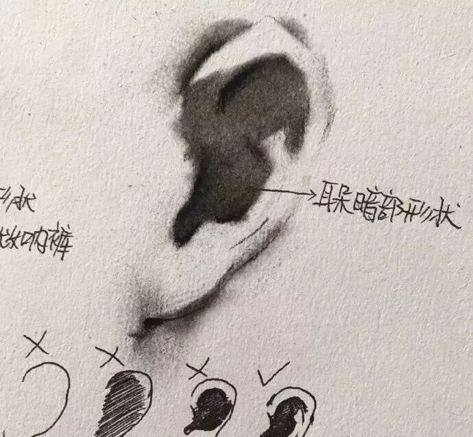 耳朵厚度比较小,刻画时,也要把耳朵的三大面表现出来,即反光、明暗交界线、亮面。