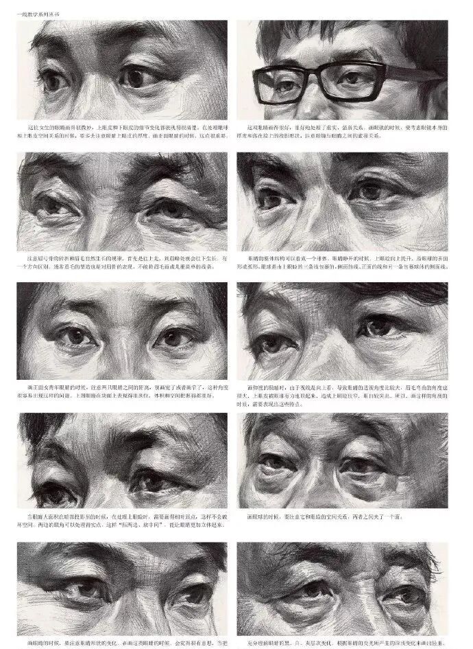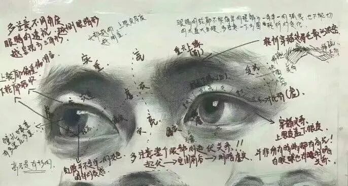 刻画眼睛,眼球要饱满,双眼皮的轮廓随着上眼皮面的转折虚实而变换。眉弓与上眼皮之间的交接处要表现清楚。
