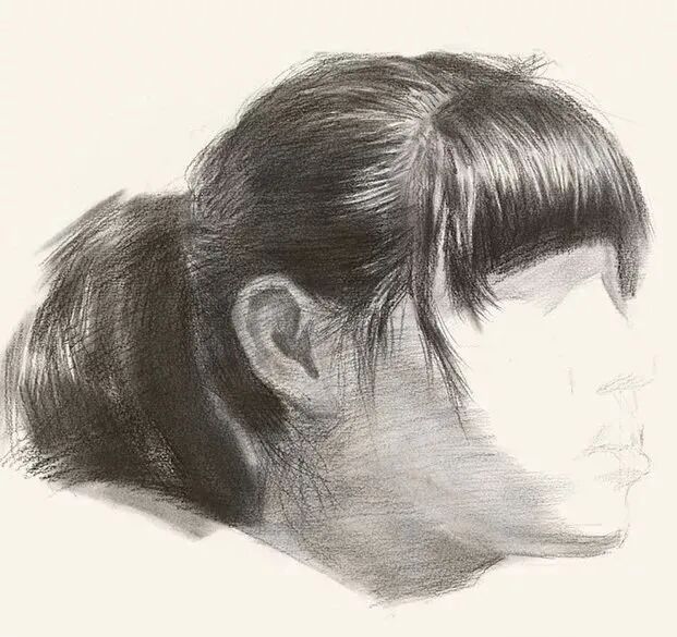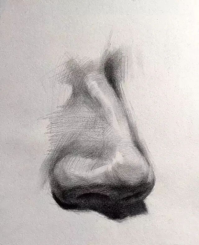 画侧脸时,很多人习惯把鼻子画得跟直线一样,或者把轮廓线扣的太死,轮廓线是有虚实关系。注意:鼻翼处的空间明暗,与其鼻孔从里往外的空间明暗处理,虚实表现要到位。